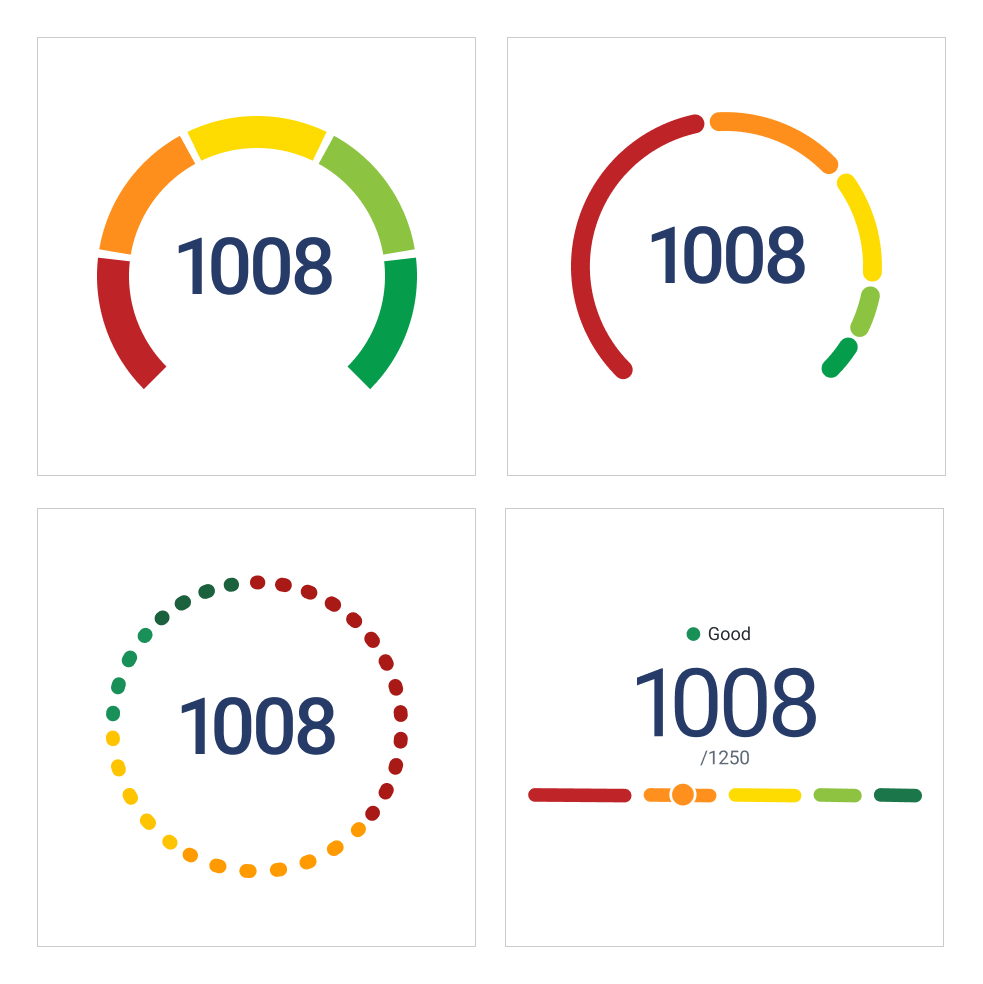 Currently, the dial uses a semi-circle format, with colours ranging from red and orange (for lower scores) through to green (for higher scores). I explored alternative visual formats, including: